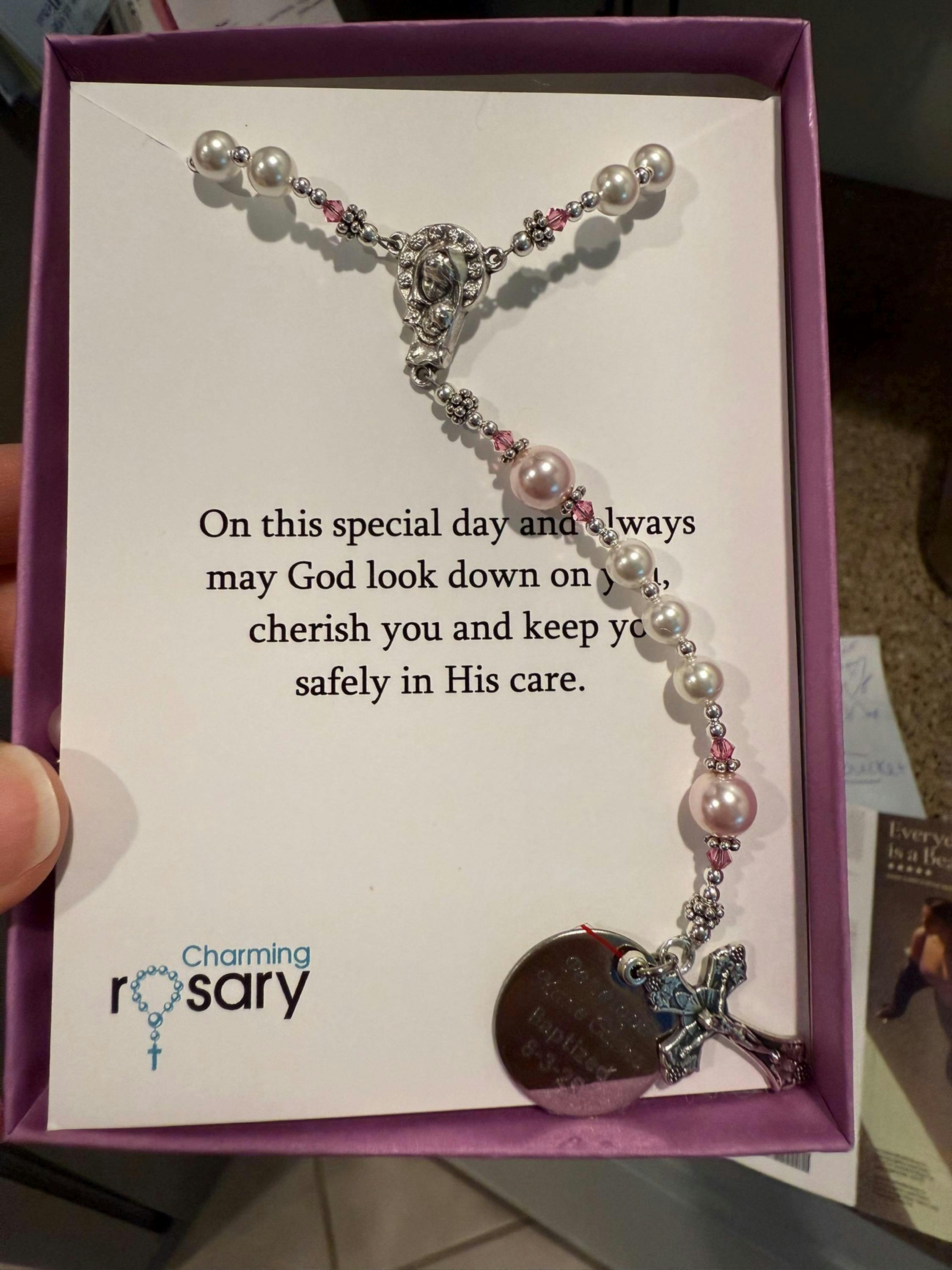 The rosary should be used under adult supervision and contains small parts. Choking hazard for children under 3.