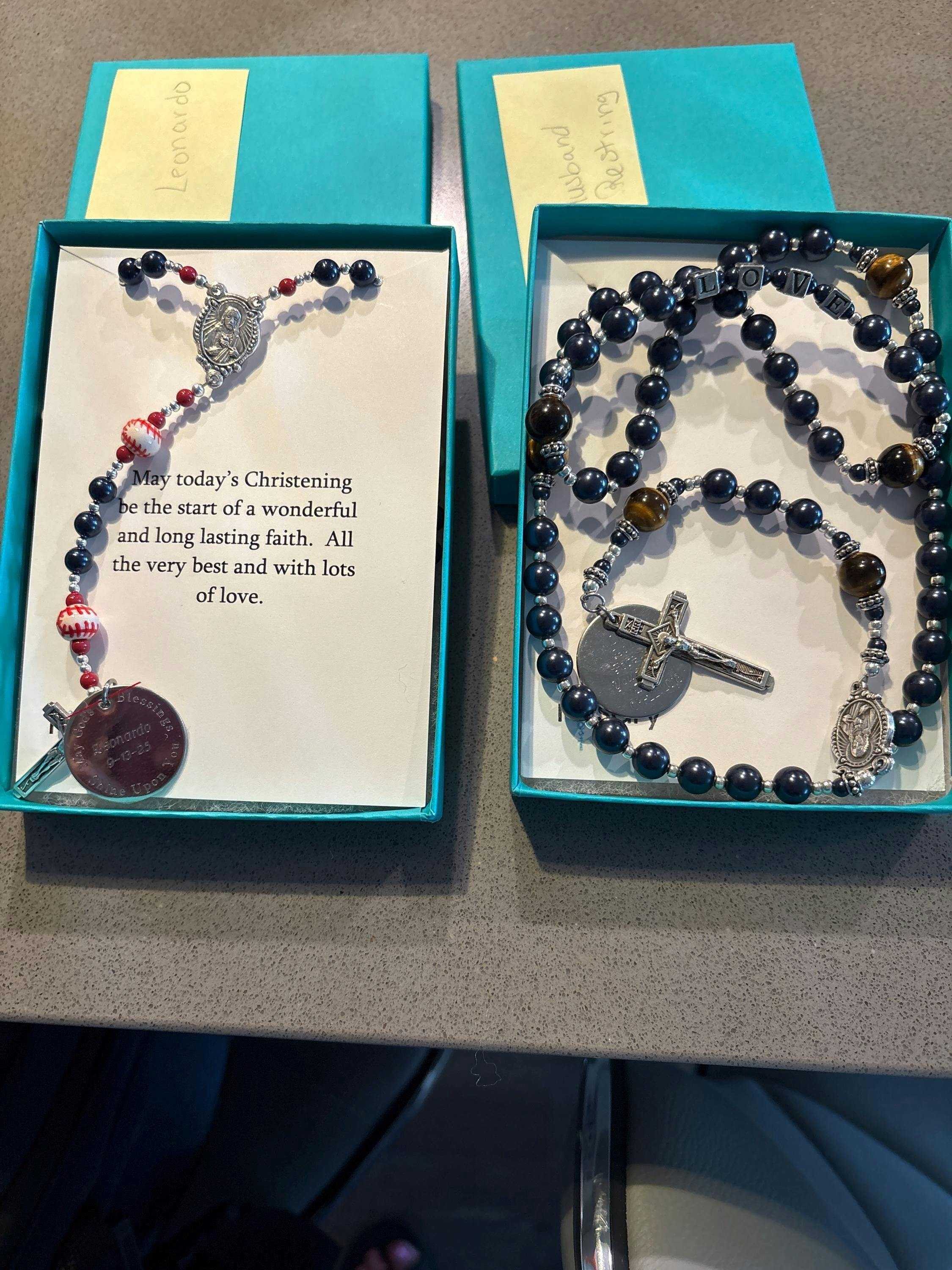 This baseball baptism rosary is a fun and meaningful catholic gift to grow with the budding sports fan. The custom rosary is handmade with the finest red and blue Austrian pearls and Peruvian baseball ceramic beads. There is an option to add engraving and a boy's name in beads. It comes gift ready to celebrate this special sacrament.
