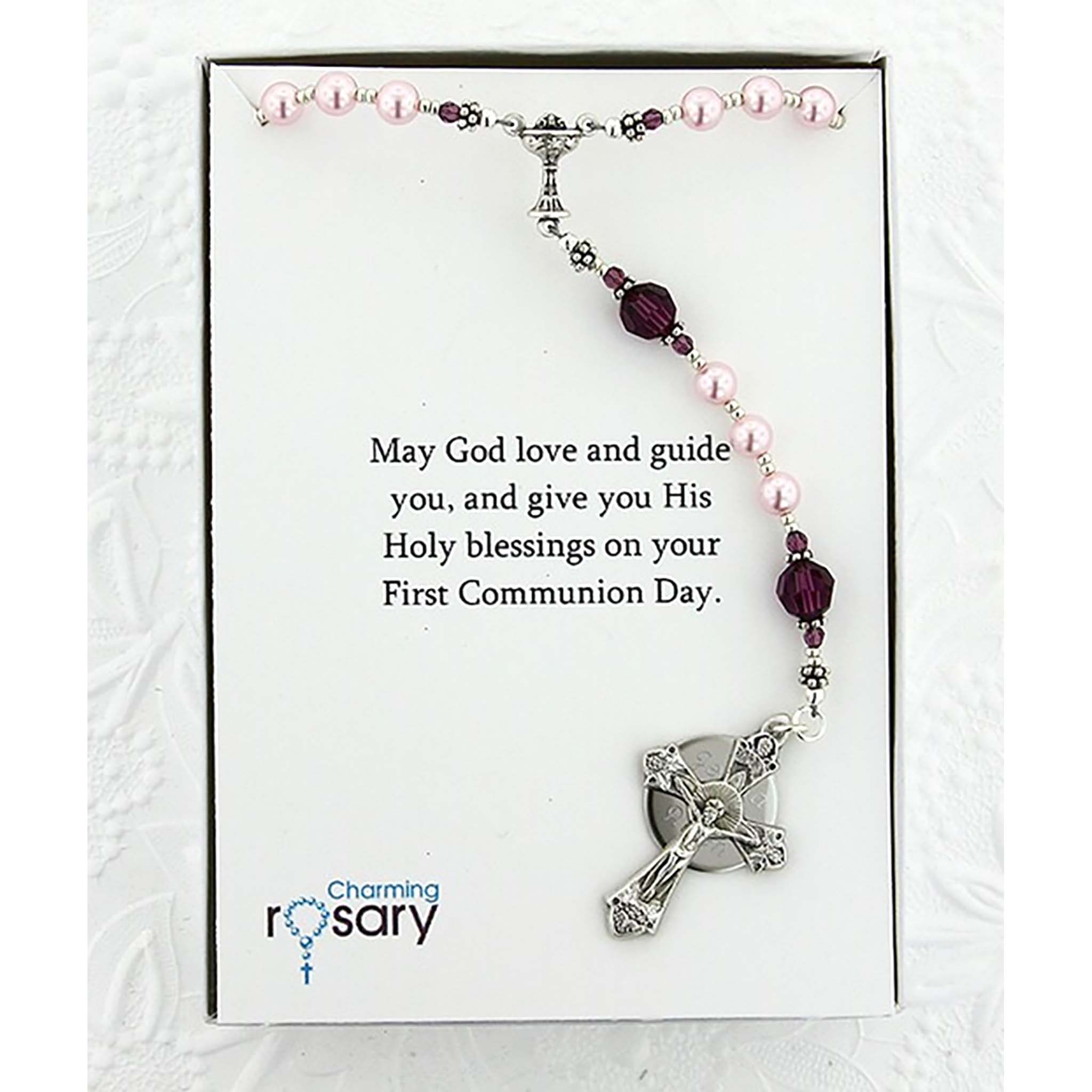 This custom First Communion rosary combines the elegance of pink Austrian crystal core pearls with sparkling Amethyst crystals. The girl's rosary can be personalized with a name in beads, an engraved disc, and a thoughtful card message. Beautifully packaged, this First Holy Communion gift is the perfect way to commemorate this special Catholic milestone.