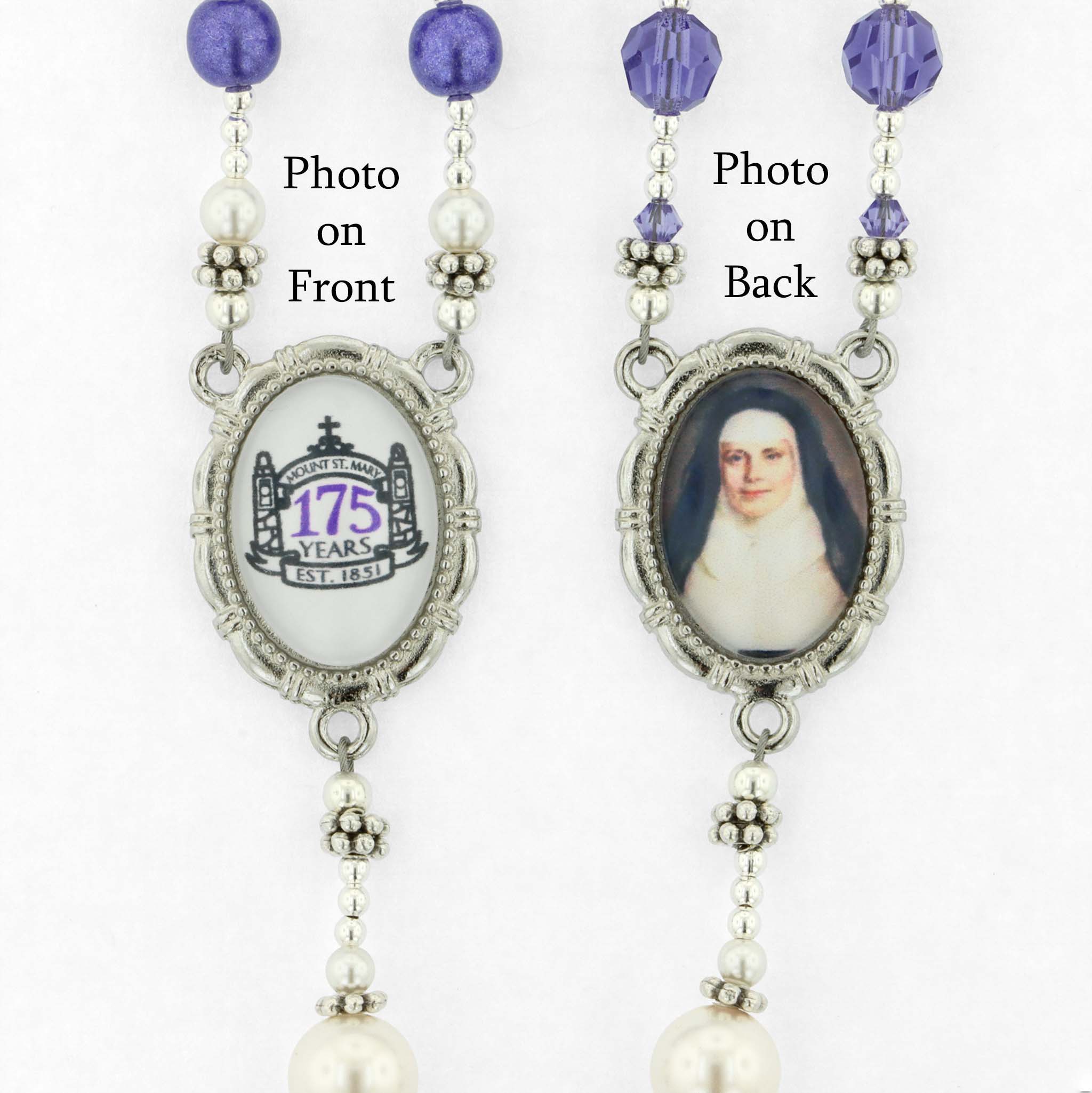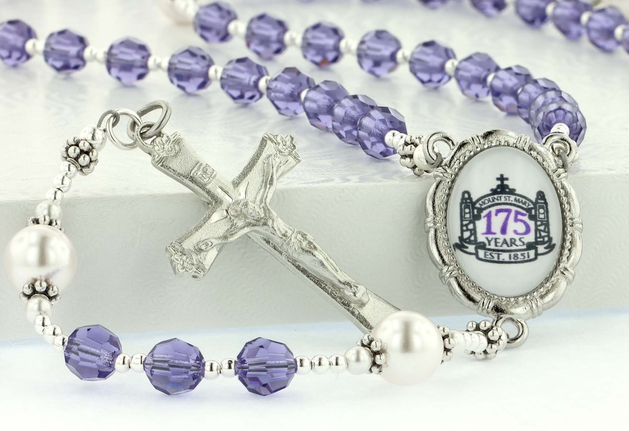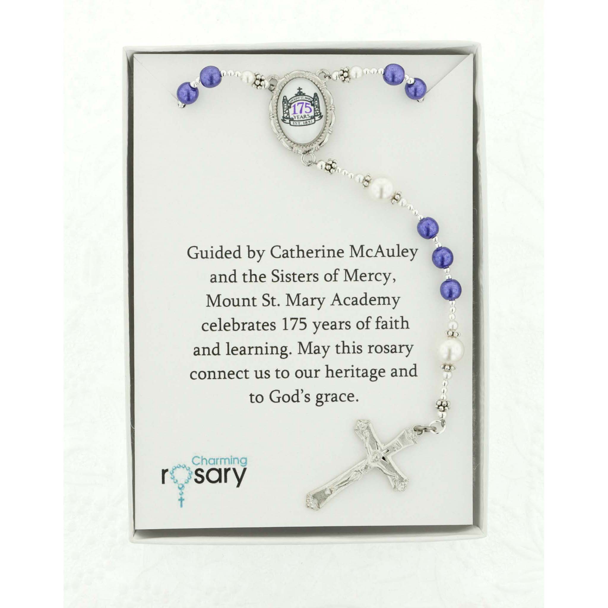 Celebrate 175 years of Mount St. Mary Academy with an exclusive anniversary rosary. Choose from two styles, Czech glass or sparkling Preciosa crystals, handcrafted in school colors. Each rosary features a double-sided center with the 175th Anniversary Crest and Catherine McAuley, founder of the Sisters of Mercy,