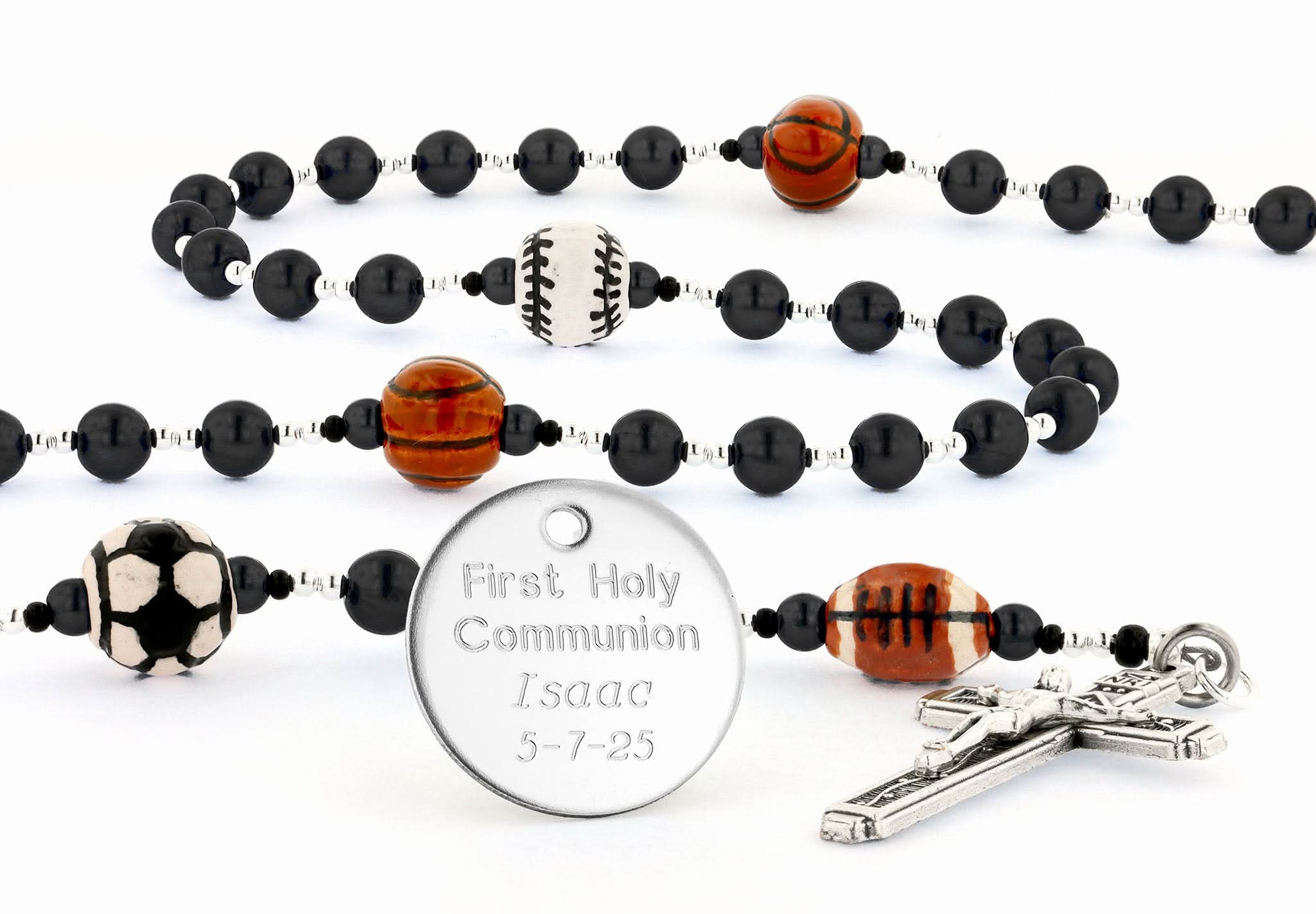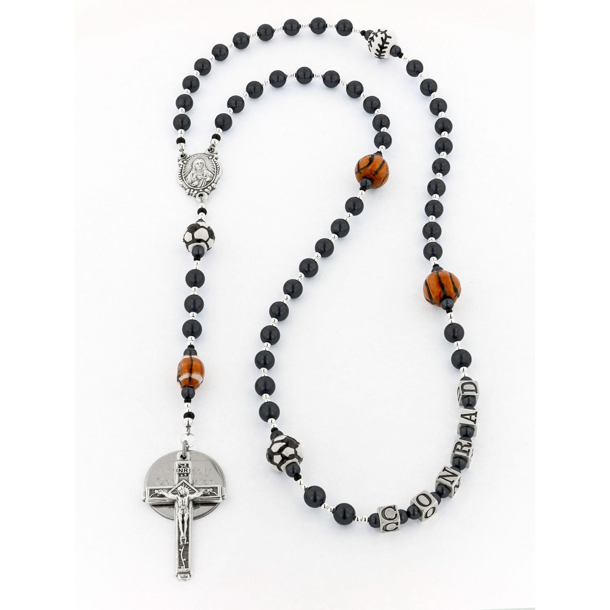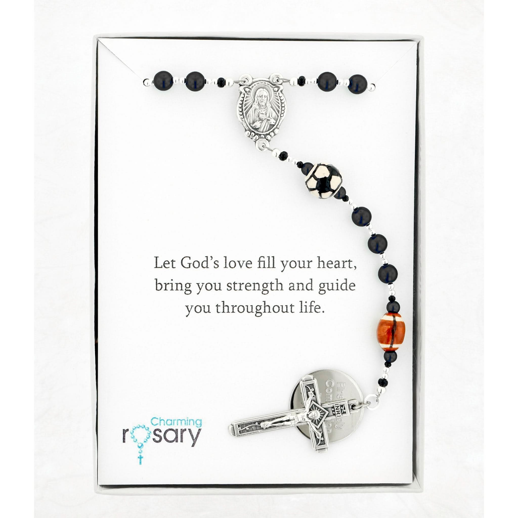 This sports rosary is designed for fun and faith. Basketball, soccer, football, and baseball beads are hand-painted from Peru and framed by black Austrian pearls. The First Holy Communion gift can be personalized with a name in beads, an engraved disc, and a custom message card. It arrives beautifully boxed and ready for gift giving.
